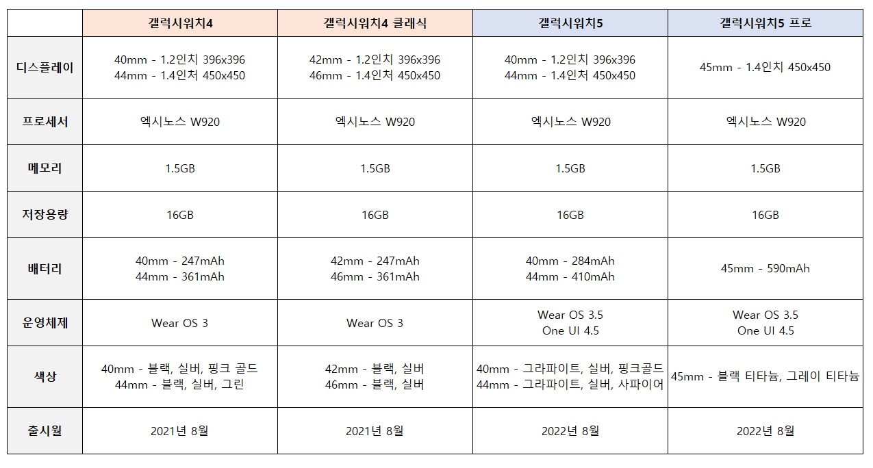 갤럭시 워치5와 갤럭시 워치4의 스펙을 비교 정리해보았습니다.